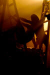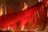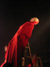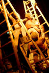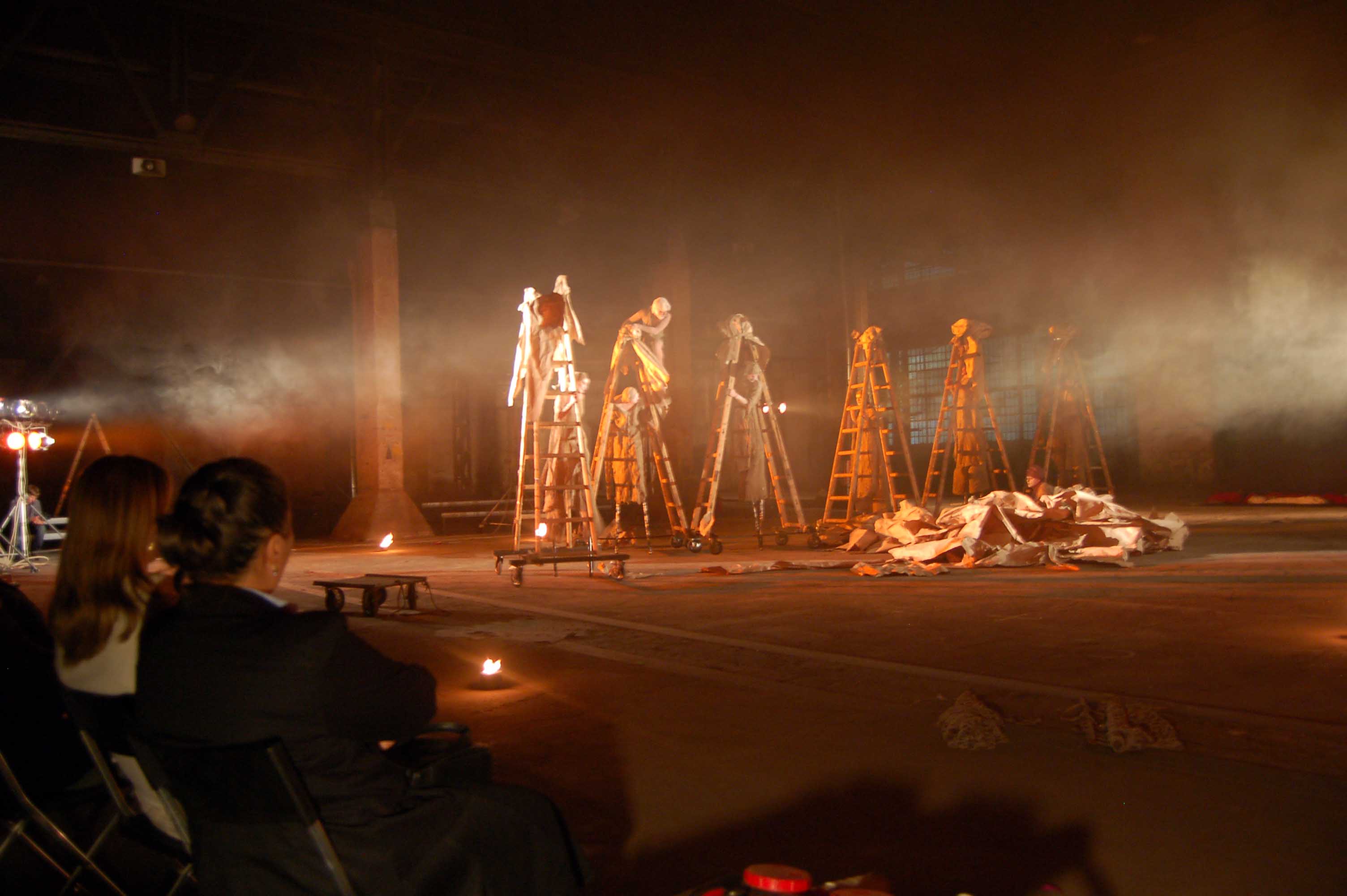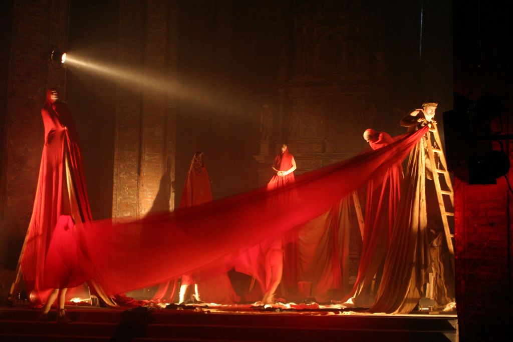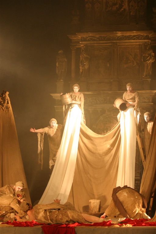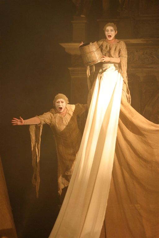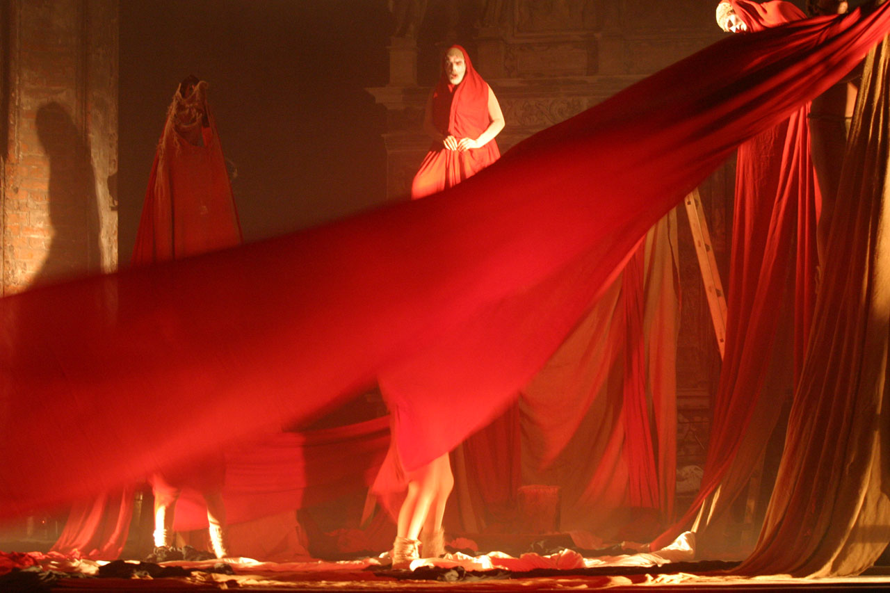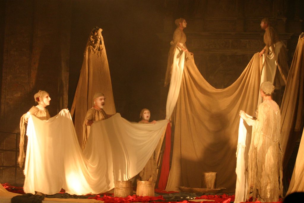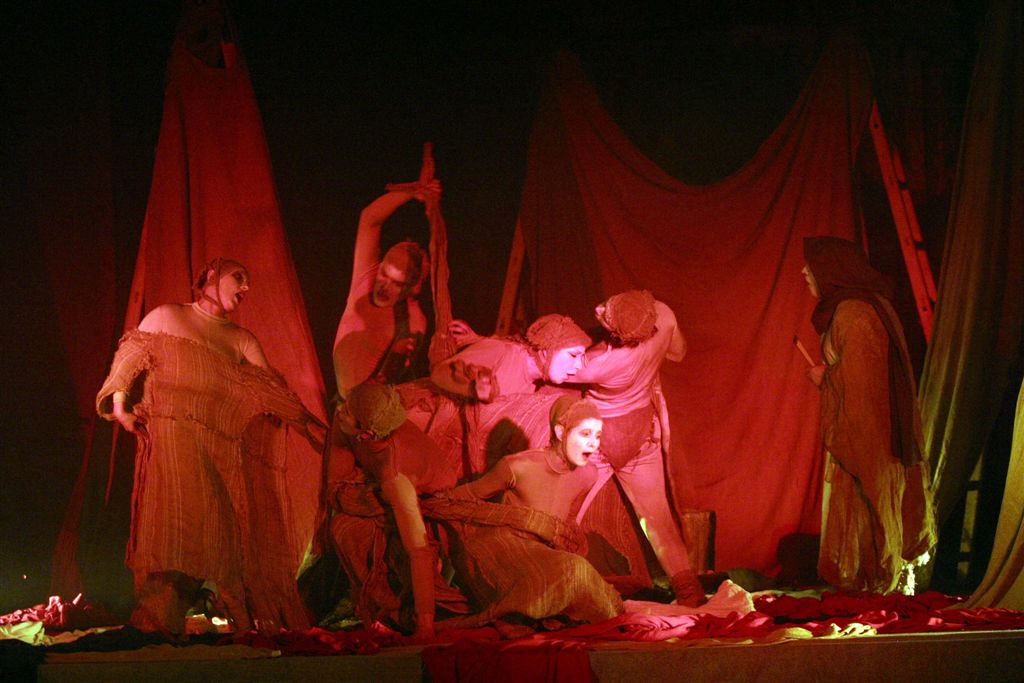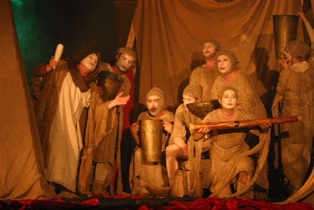 The music of the performance is transferred from the Orthodox Church choral singings. Just like in ancient drama the actors consist the chorus which leads the Guide of Chorus - Miron Dacko, the music composer and conductor. Singing is accompanied by primitive clay and wooden instrumentation imitating storm Such music harmonizes with chorus figures which forms sort of beggars’ procession that would be invited to house by generous Hioba. This procession becomes the witness of Hiob’s tragedy, the children's death and the loss of property. Costumes and scenography by Ala Fedoryszyna deserve a special attention. The straight lines of fabric, the baggy material caused that playing in performance actors had become a beggars' procession, and when they altered tune on black or red rags the costume became a part of dramatic action of drama, underlined the horror of manslaughters and rapes and added the expression to the lamenting Hiob’s sons and daughter. Scenography is very simple. Straight lines ladder, which were at the beginning a Hiob’s hospitable house then became stripped with wealth the household of Hiob - beggar. They became also a cross on which Messiah was hung, later on also a cave of revelation in which figure reminding God's Mother appeared. Old fashioned equipments remaining on stage like seat, bowl to bath, pitcher, baskets on food, also adapted to scenography and costumes straight lines. Light enriched the whole story. All this in sure sense is similar to ancient theatre, but at the same time reminds also modern world theatre approaches proposed by Peter Brooke or Jerzy Grotowski. Audience met straight substance of theatre: actor, choreography, voice, who creates moods, dramatic tensions and music.