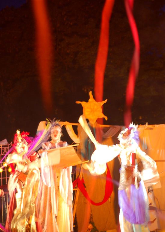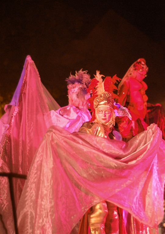 Динамічна музика, яскраві костюми, маски, ходульні сцени